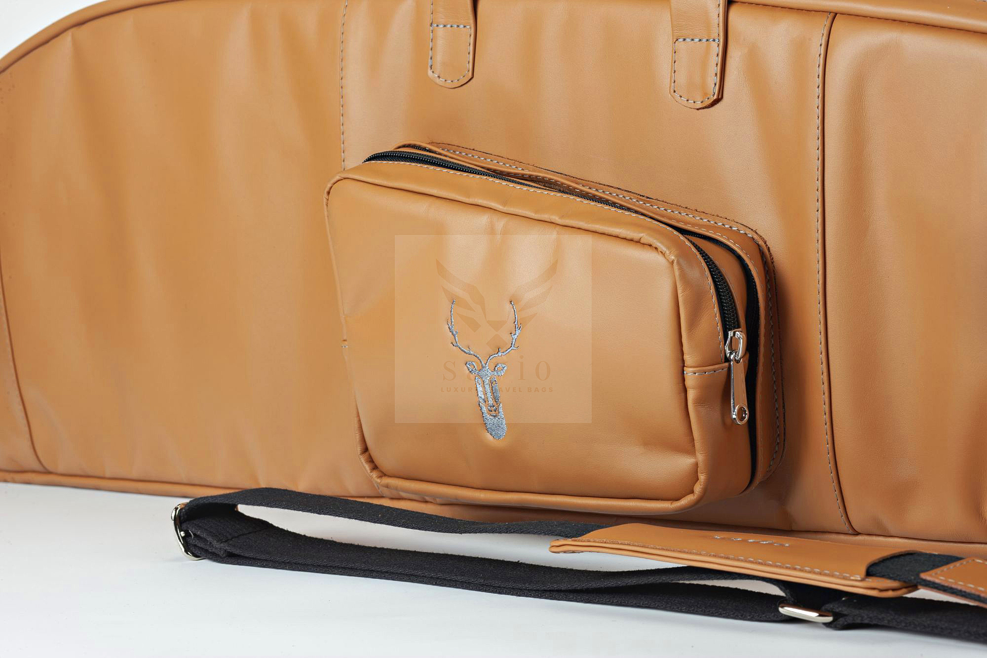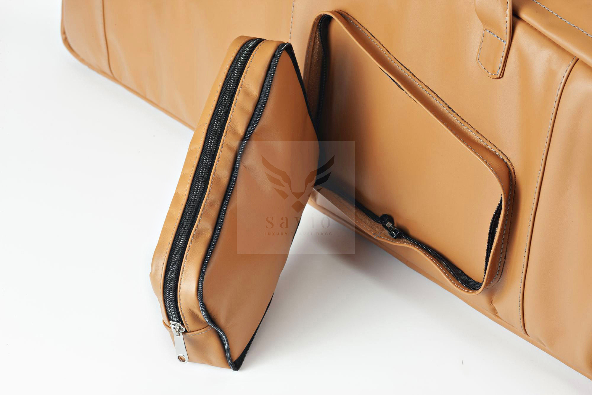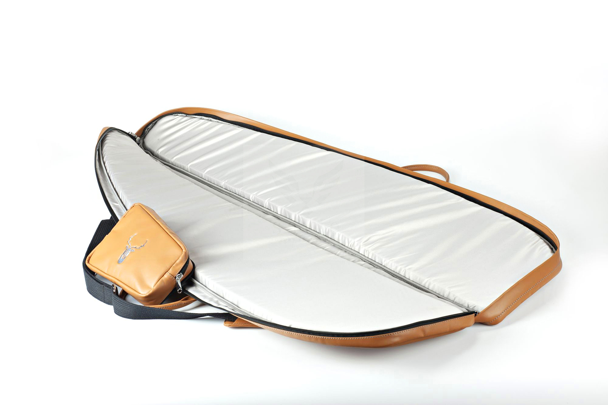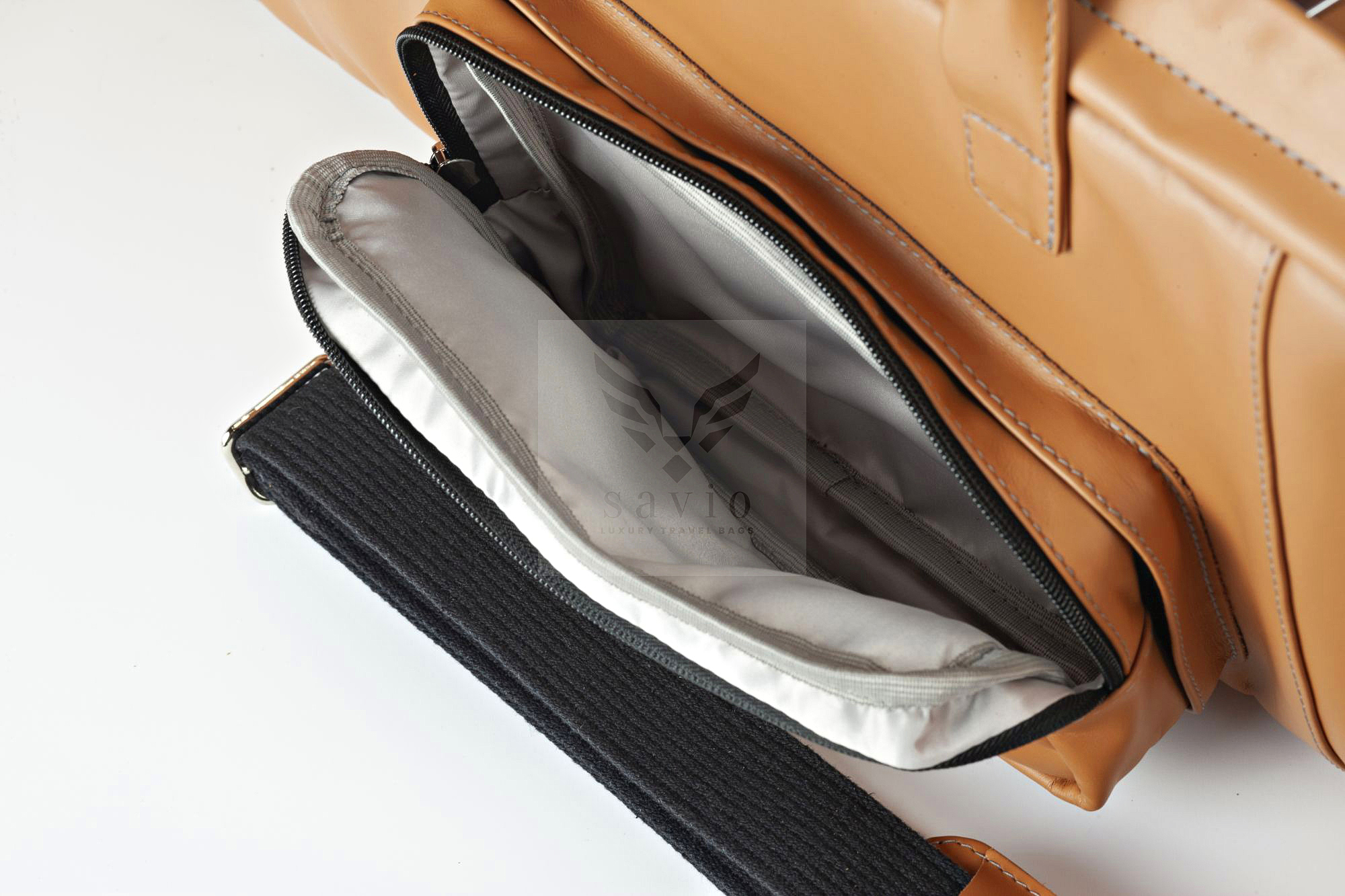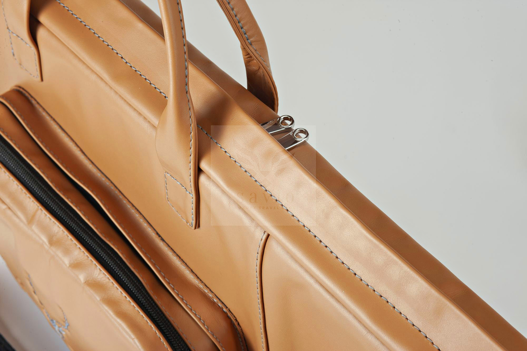 Materiał główny to skóra Tuscania w kolorze light brown. Wewnątrz – gąbka obleczona gładkim materiałem, dodatkowo odpinany rzep do regulacji wielkości/wypełnienia wnętrza. Zewnętrzny akcesornik na zamek. Dopinany i regulowany, pasek na ramię.