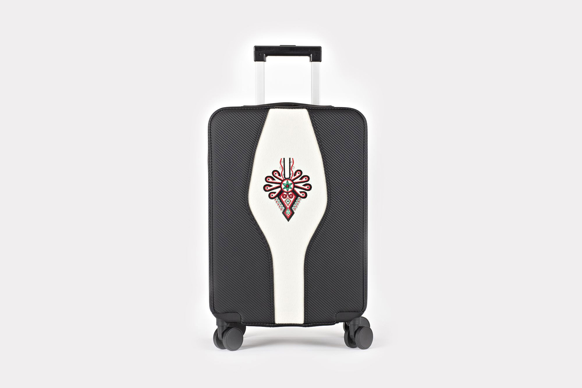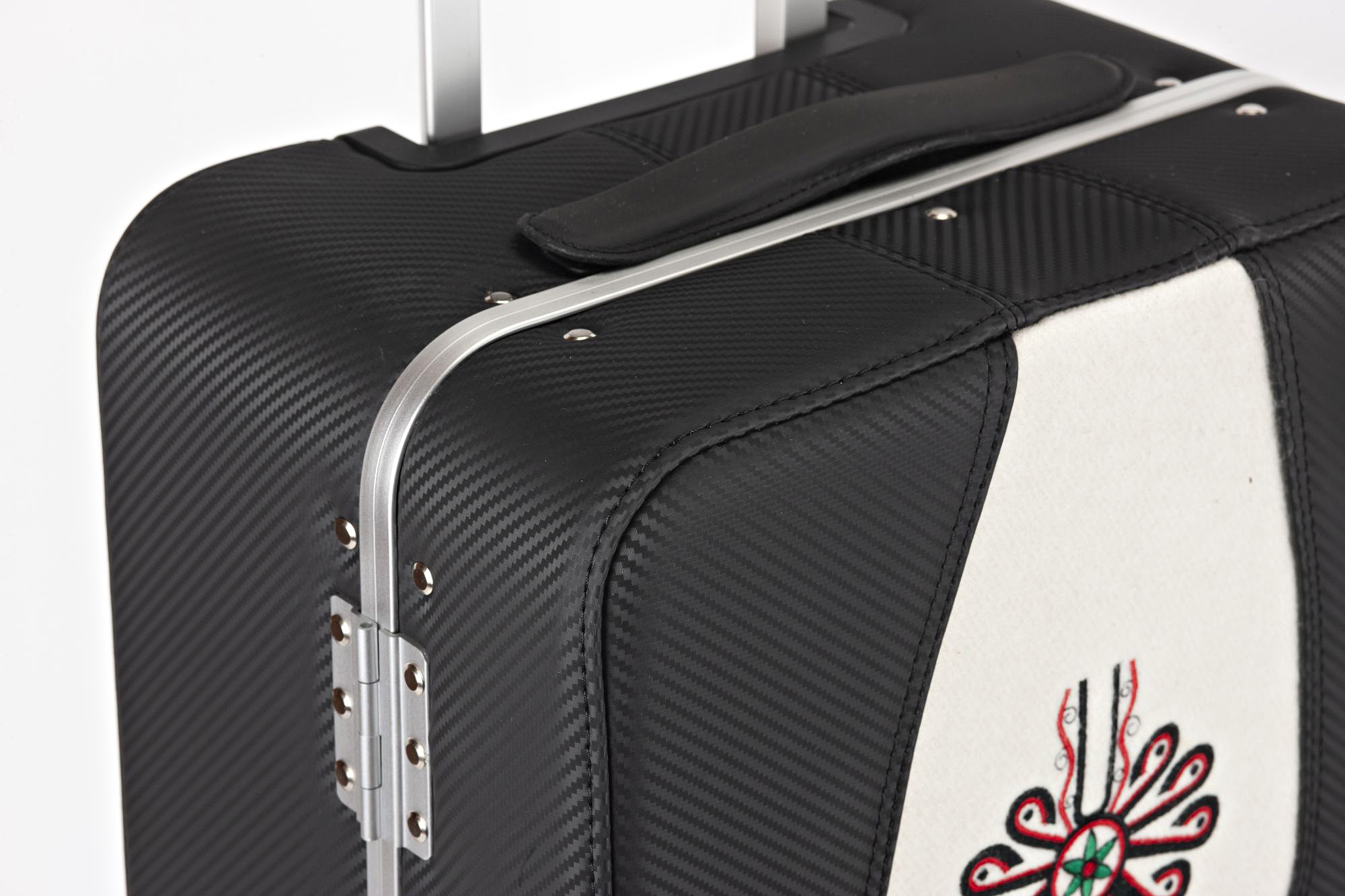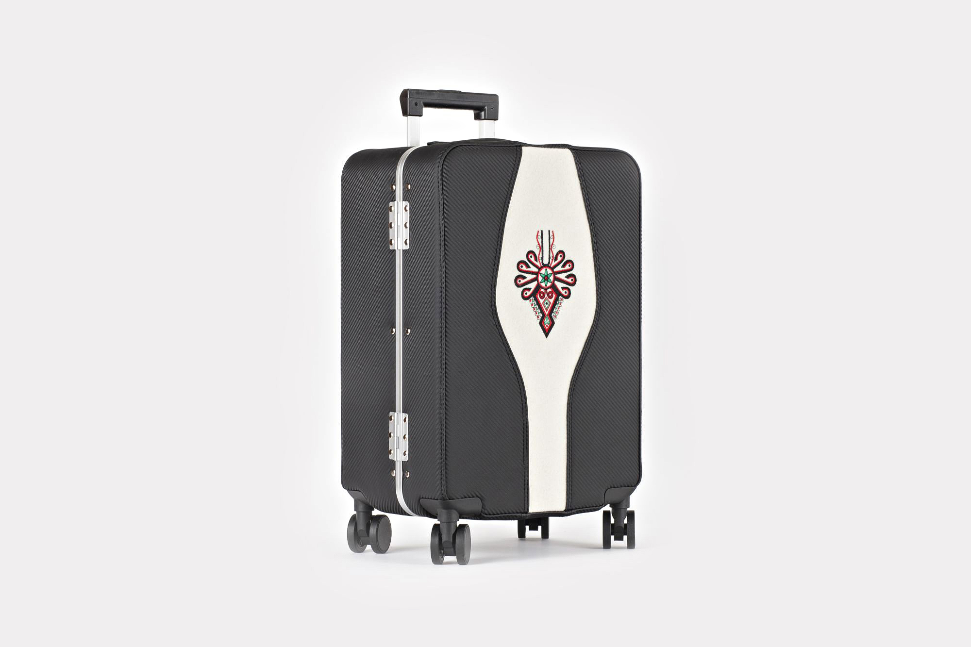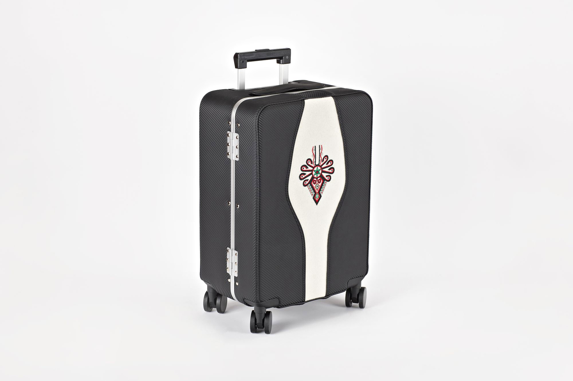 Karbonowy góral. Walizka klasyczna Savio z wielokolorowym i bogatym wzorniczo motywem parzenicy. Obłożona materiałem imitującym karbon (ekoskóra), środkiem przeszyta naturalnym suknem białym. Jest to model z naszej serii walizek z motywami regionalnymi.