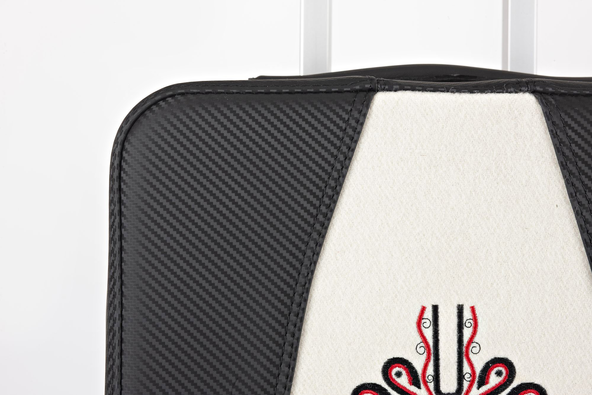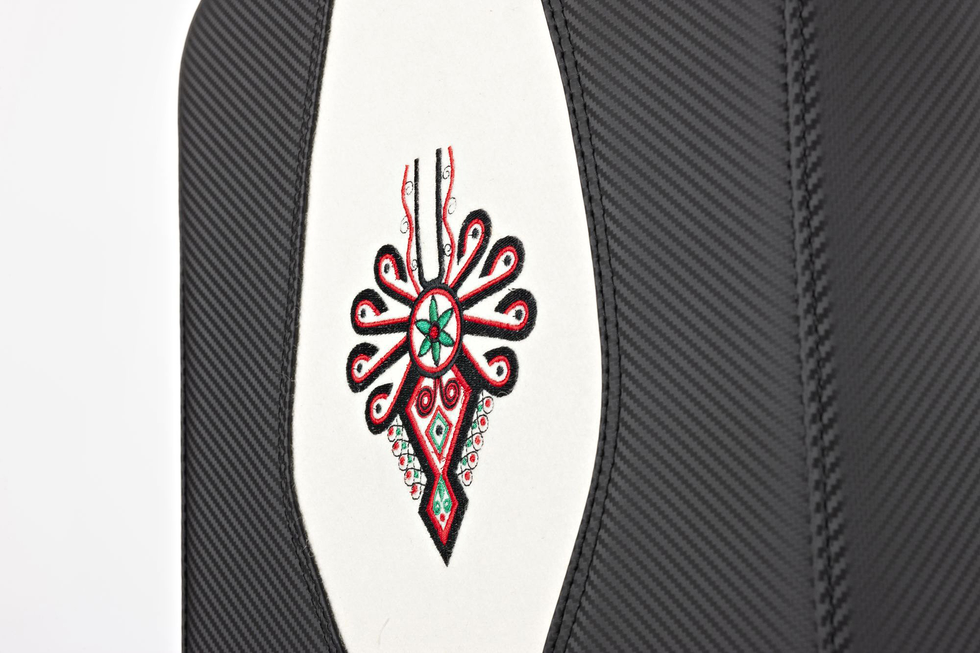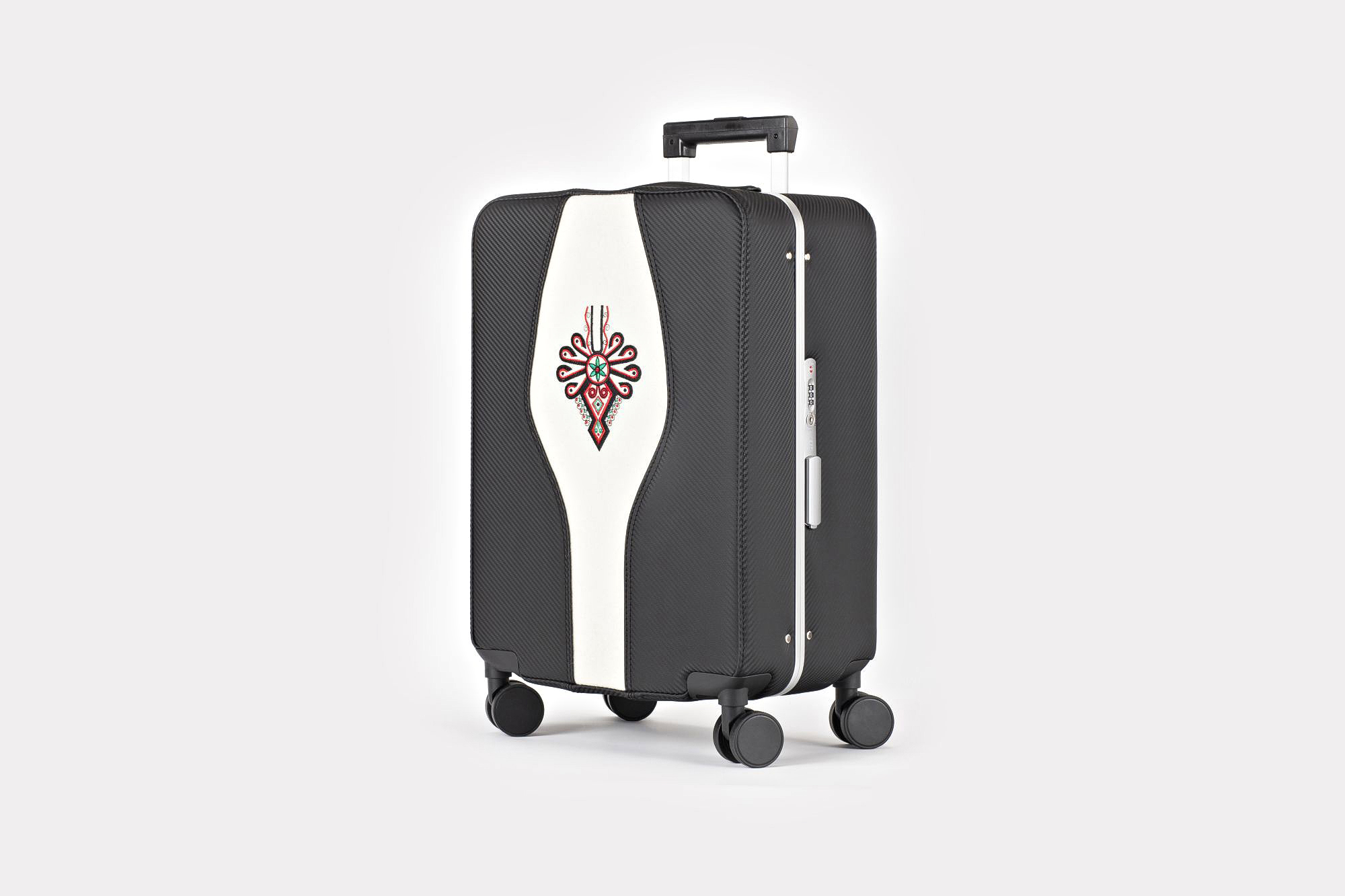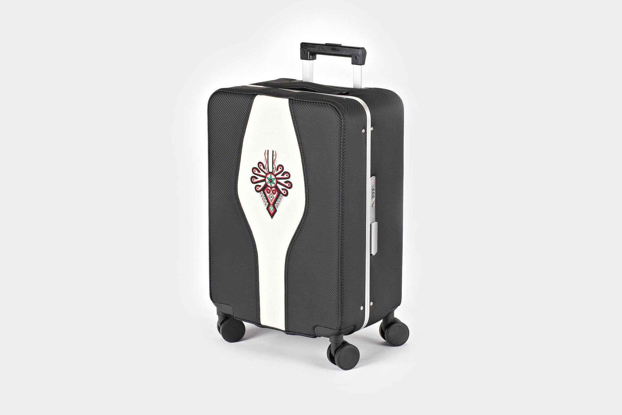 Karbonowy góral. Walizka klasyczna Savio z wielokolorowym i bogatym wzorniczo motywem parzenicy. Obłożona materiałem imitującym karbon (ekoskóra), środkiem przeszyta naturalnym suknem białym. Jest to model z naszej serii walizek z motywami regionalnymi.