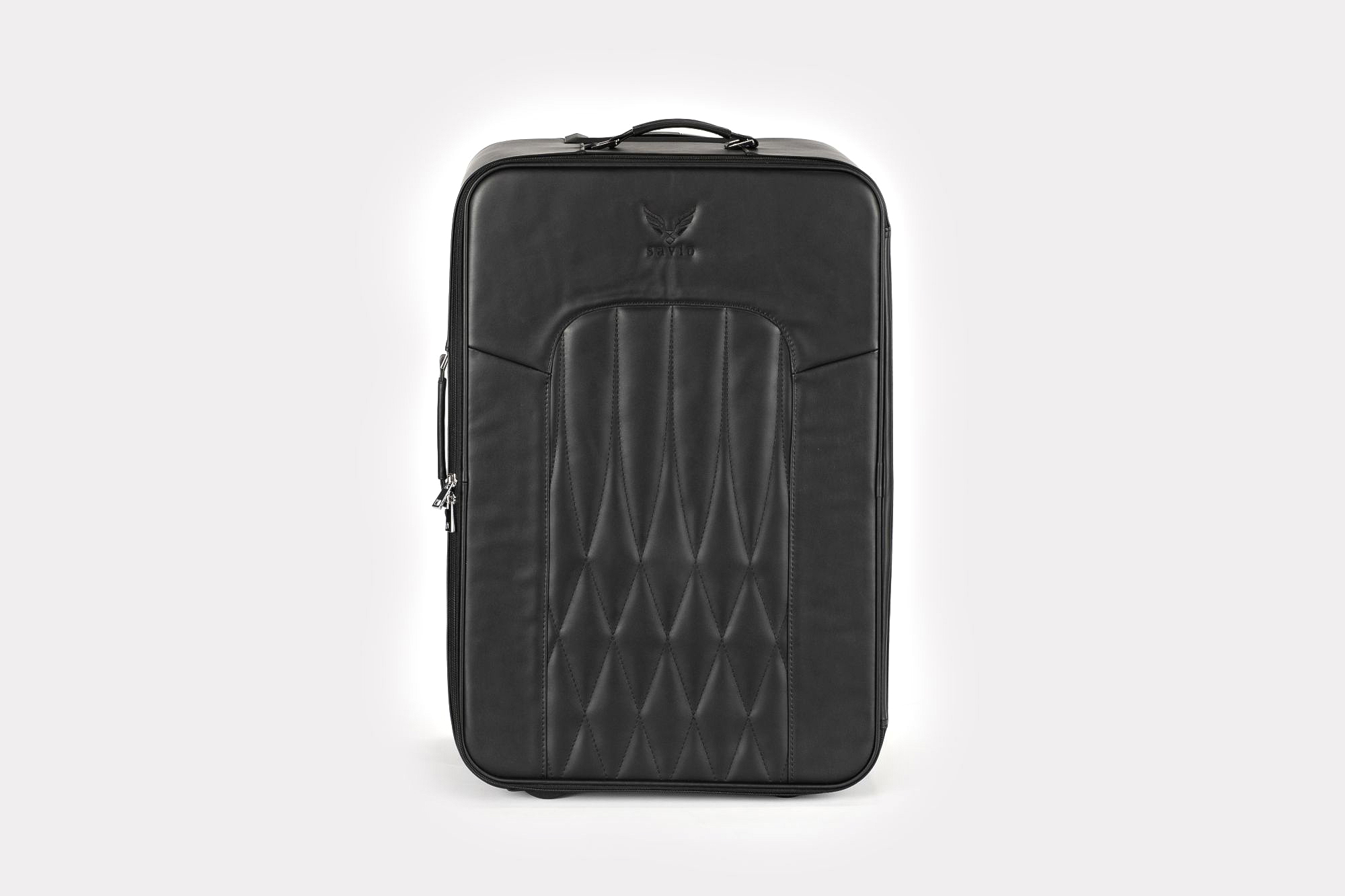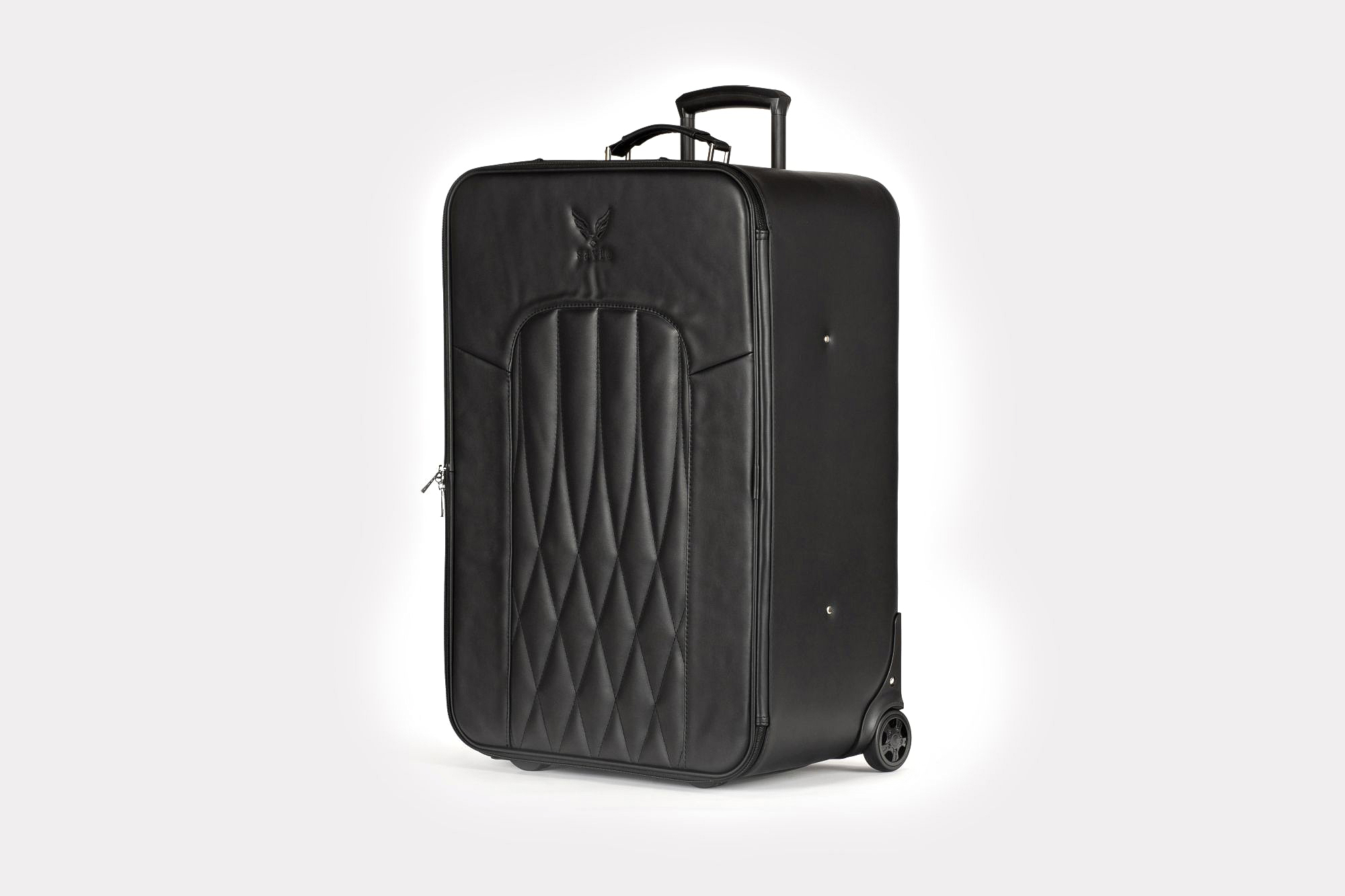 Duża waliza podróżna. Pikowanie frontu zainspirowane tapicerką foteli marki Mercedes.